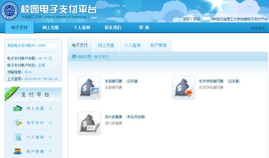 校园电子支付平台的功能:校园电子支付平台支持多种校内小额缴费,目前开通四、六级报名缴费和网费缴费,未来可根据需求增加缴费项目。电子支付平台采用一卡一电子钱包账户方式,“一卡”指校园玉兰卡,“一电子钱包”指电子支付平台中的资金账户。目前资金来源支持银行转账和校园玉兰卡转账两种方式:与校园玉兰卡绑定的银行账户可向电子支付平台的资金账户进行单向转帐(在校园电子支付平台网站上操作);校园玉兰卡账户可与电子支付平台的资金账户进行双向转账(在校园卡自助终端机上操作)。