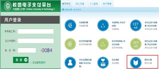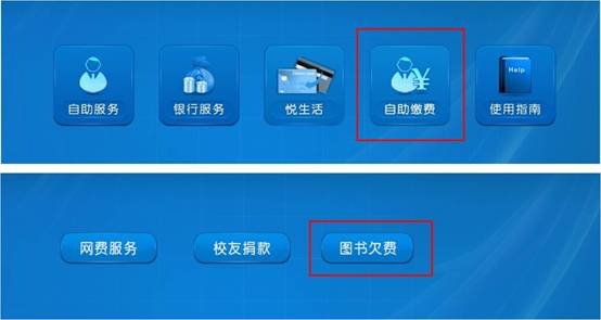 在校园卡自助终端机页面选择“自助缴费”栏目下的“图书欠费”,根据提示填写相关信息,包括玉兰卡密码等完成支付。
