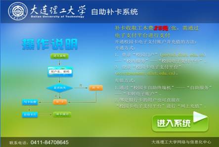 选择自助补卡机页面上的“进入系统”,按系统提示分别输入学号、密码。已挂失卡的同学可以直接补卡,未挂失卡的同学需按系统提示先挂失再补卡。等待3-5分钟,待自助补卡机完成打印、写卡后,从“取卡口”取回新卡,补卡成功。