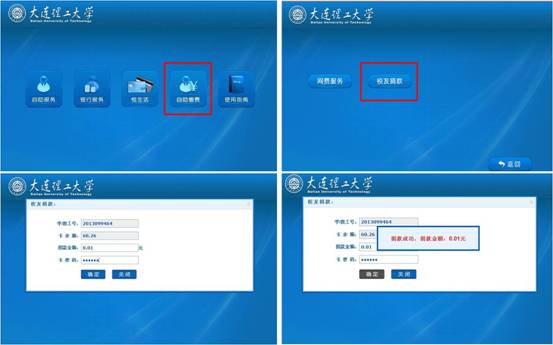 在校园自助终端机页面选择“自助缴费”栏目下的“校友捐款”,根据提示填写相关信息,包括捐款金额,玉兰卡密码等完成捐款。