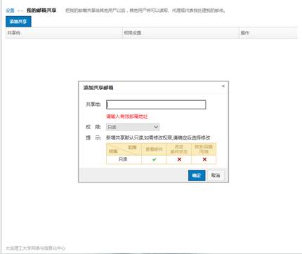 用户在“设置”—“邮箱设置”中可设置“我的邮箱共享”。用户进入设置界面,可添加共享邮箱,并对共享的邮箱设置权限。当用户邮箱收到邮件后,共享邮箱也可以看到该邮件。共享邮箱的权限分为只读、代理发送、代表发送三种。