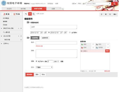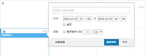 用户点击“完整编辑”可进入事件完整编辑页面,可设置活动详情,选择地点,进行简单说明,设置邮件提醒,添加邀请人。事件完整编辑页面如下图所示: