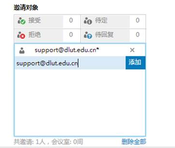 在“邀请对象”编辑框中,需要用户手动添加会议或事件相关的对象,输入相关人员的邮箱地址,然后点“添加”按钮,该人员便被添加到该事件中,新建事件保存后,系统会自动给被邀请人发送邀请邮件,被邀请人收到邀请邮件后,可选择“接受”、“暂定”和“拒绝”,选择后,系统会自动给会议的发起人发送通知邮件。