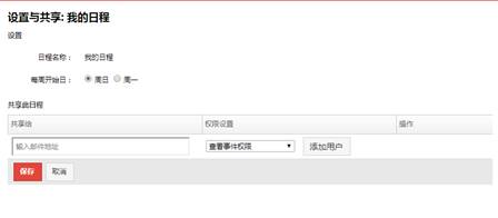 点击“我的日程”或自己新建日程旁边的齿轮图标,可进入日程设置页面。在该页面用户可将日程分享给指定的用户。例如A用户将自己的“我的日程”设置分享给B用户,B用户会收到提示邮件,并且在登录Web版邮件系统后,可在“会议与日程”菜单下查看到A用户共享的所有日程。