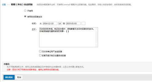 用户在“设置”—“邮箱设置”中,可进入“假期(外出)自动回复”设置假期或外出期间的自动回复。用户可设置在固定时间段内,自动回复收到的邮件。