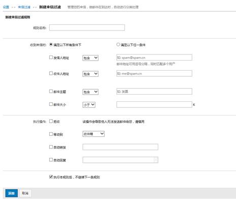 用户在“收件箱”中可对收到的邮件直接进行过滤,点击“来信过滤”,进入相关的设置界面。可根据实际需要设置不同的规则,利用该功能,用户可以根据自己设置的规则,对收到的邮件进行拒收、移动到特定文件夹、自动转发到其他邮箱或进行自动回复。