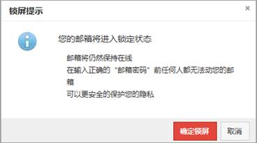 用户点击“锁屏”按钮后,邮件系统将进入锁定状态,web页面中无法看到邮箱中的内容,也无法进行任何操作,只有输入正确的密码后,系统才会解锁。方便了用户在短暂离开时,可以更安全的保护自己的隐私。