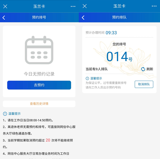 根据疫情防控要求,为了方便师生时间安排网信中心预约排号系统现上线试运行,该系统用于当天在网信中心服务大厅办理业务排号使用,采用现场排号与网上预约同步进行方式。使用方法如下: