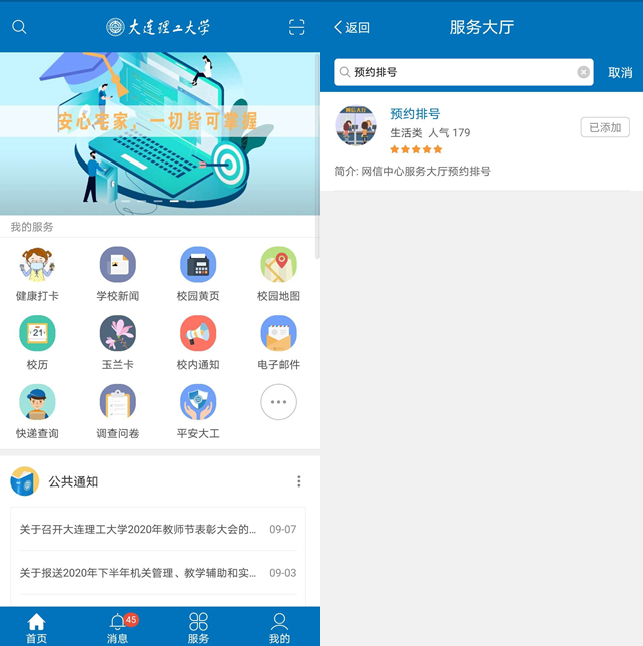 1、登录手机端“i大工”APP,在“我的服务”-“前往服务大厅,添加更多”-搜索“预约排号”。