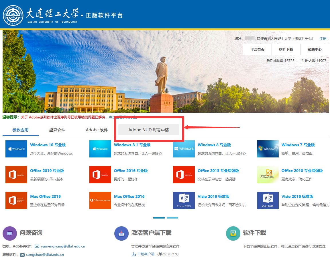 1.通过统一身份认证登录学校正版软件平台(http://ms.)后,在平台首页找到“Adobe NUD账号申请”点击进行申请。