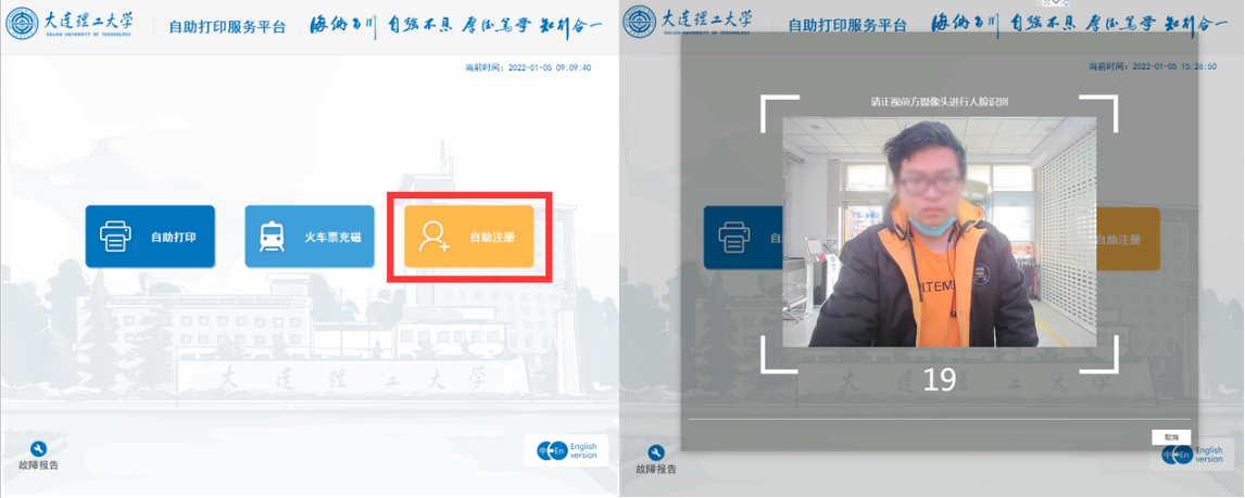 1.在自助打印终端首页选择“自助注册”,根据提示将身份证放置到对应的读卡区进行读卡,同时进行人脸识别核验。