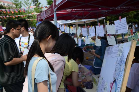 玩过精彩的游戏,穿过马路对面就是“留下你的网址”以及“网信中心我想对你说”的活动现场了。“留下你的网址”旨在共享学习资源,引导大家正确利用网络,而“网信中心我想对你说”则是为同学们与网信中心搭建了一个沟通与了解的平台。在这里,有的同学留下自己喜欢的网址及实用的APP名称贴在展览板上与大家共享,有的同学写下了对网信中心的建议和期待。参与活动的王同学表示,“一直想向网信中心反映有关网络的问题却苦于没有途径,现在网络文化节提供了这样一个桥梁,感觉非常好,真正关注到了同学们的需求。”