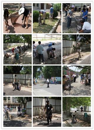 活动中,大家两人一个垃圾袋,分组捡拾着被随意丢弃在路边草丛中的塑料袋、废纸、烟头、饮料瓶等垃圾。尽管烈日炎炎,却丝毫没有影响大家高涨的情绪。师生们不怕苦、不怕脏、不怕累,将西门附近的小街打扫的干干净净。