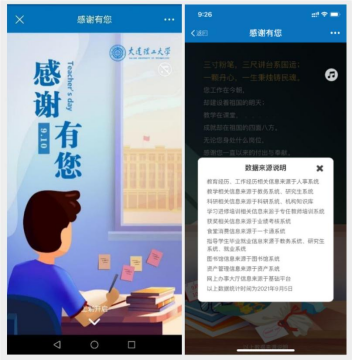 利用好信息化成果,开展教师节个性献礼——在第37个教师节来临之际,网信中心利用数据治理的成果,在教师节当天向全校4780名教职工进行了“教师节快乐--一路走来,感恩有您”的个性推送,为教师们送去节日祝福。推送从不同维度回顾了教师每个人在大工不同的光阴岁月,既反映了我校数据治理工作的成果,也是一次数据创新服务的有益尝试。