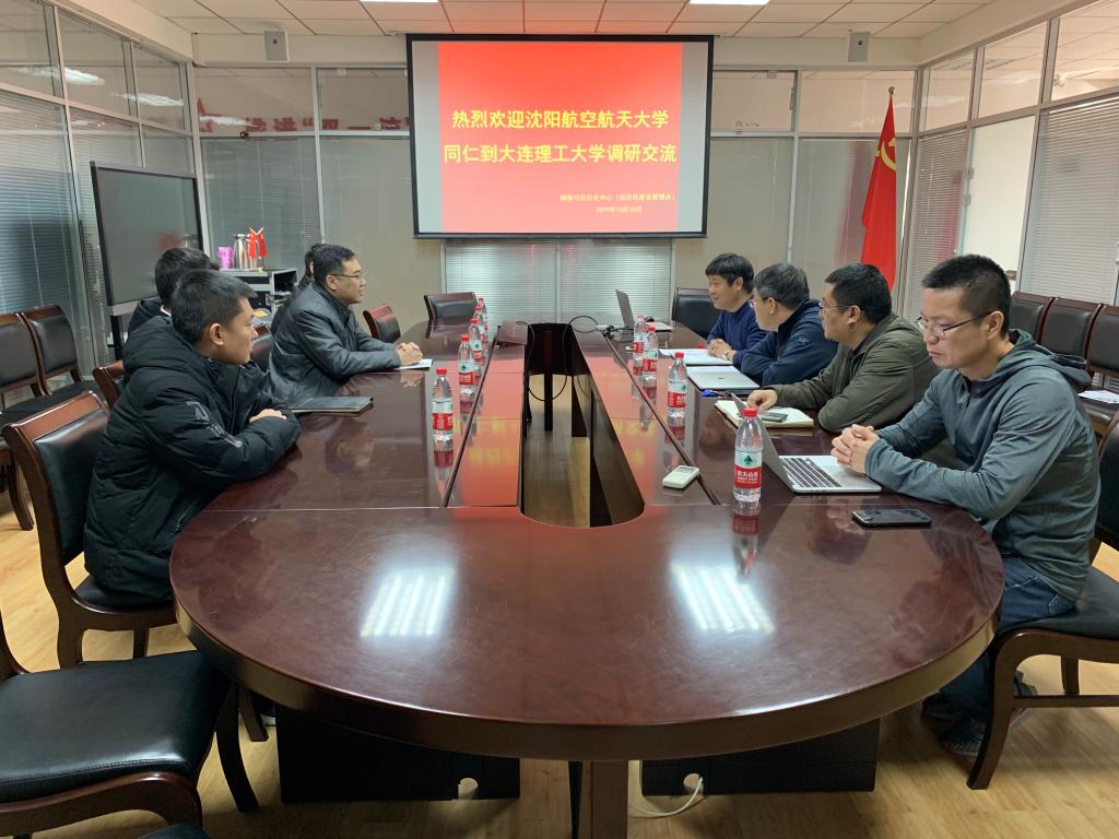 张巍主任对沈阳航空航天大学同仁的来访表示热烈欢迎,对我校信息化建设的总体情况、顶层设计、职能分工等方面进行详细介绍。随后双方围绕信息化基础服务平台建设、公共服务平台建设、校园无线网络建设与应用等方面进行细致探讨。