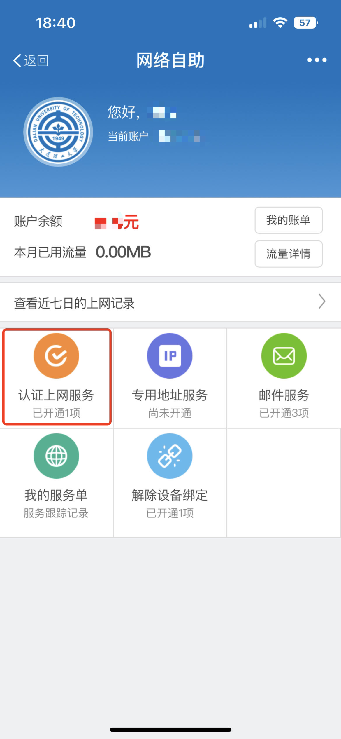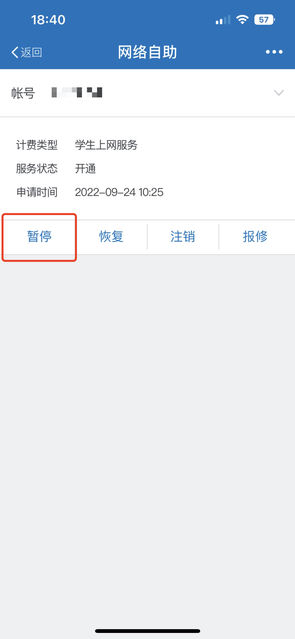 尚未返校的同学,为避免系统自动扣除月基本费,可于10月31日前,在i大工APP的“网络自助”服务中,进入“认证上网服务”,点击“暂停”按钮暂停服务。待返校后,在相同页面,点击“恢复”按钮恢复使用。