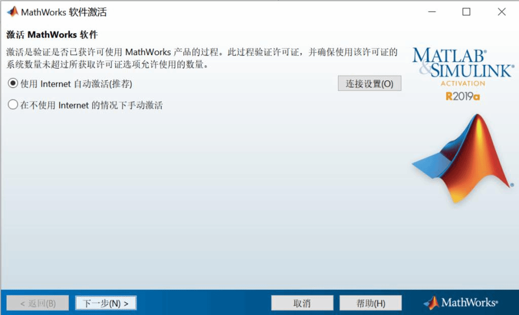3、选择“使用Internet自动激活”,并输入MathWorks账户(后缀为dlut.edu.cn或mail.dlut.edu.cn的学校邮箱),点击“下一步”直至激活完成(如果您忘记了密码,您可以从www.mathworks.cn官网自助找回)。