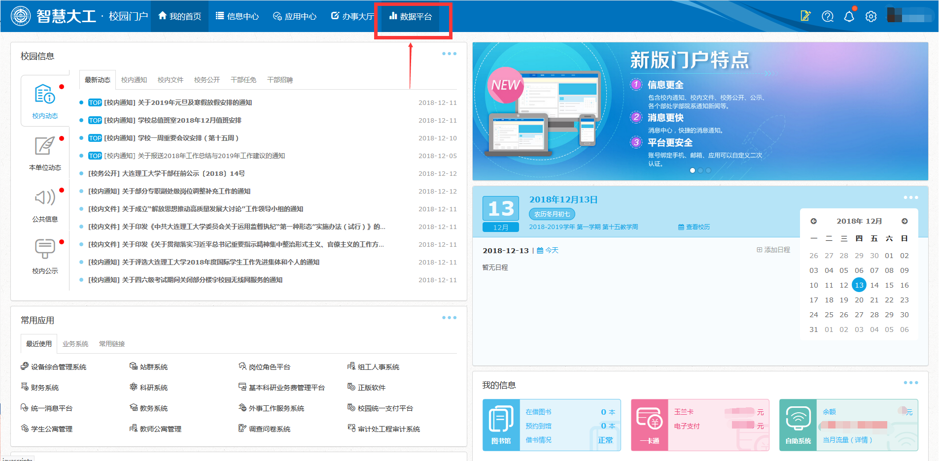 在校领导和广大师生的大力支持下,经过学校各相关部门的共同努力,公共数据平台目前已完成了与大部分业务系统的数据对接工作,全校范围的数据治理工作正在有序开展中。2018年12月14日,公共数据平台中的个人数据中心功能将面向全校师生开放,师生用户可通过校园门户中的“数据平台”模块来查看自己的“个人数字画像”和“个人数字档案”,了解自己在校的学习、教学、科研情况。