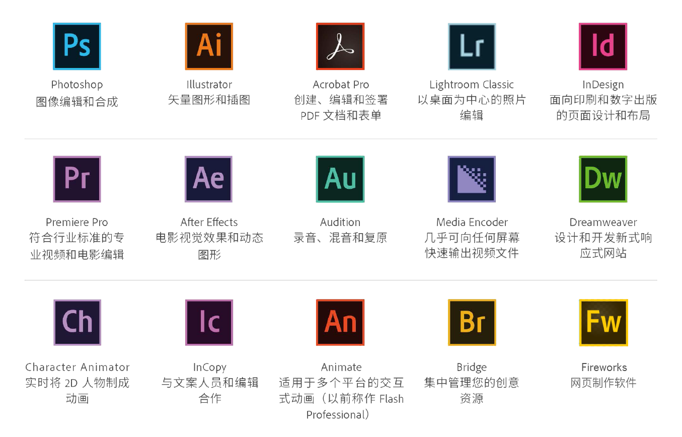 Adobe校园版系列软件是Adobe系统公司出品的一个图形设计、影像编辑与网络开发的软件产品套装。学校本次采购的Adobe Creative Cloud for Teams许可服务包含了10余个适用于Windows和Mac的旗舰创意软件,配置如下(未来软件配置将会根据Adobe公司相关产品的更新而升级或新增):