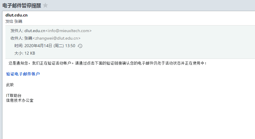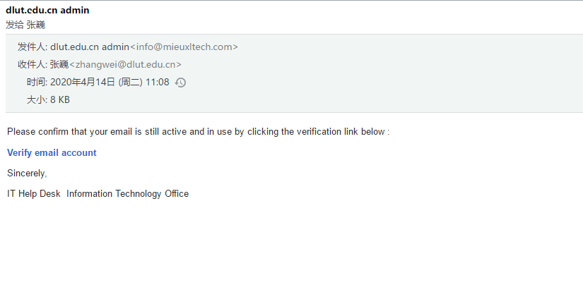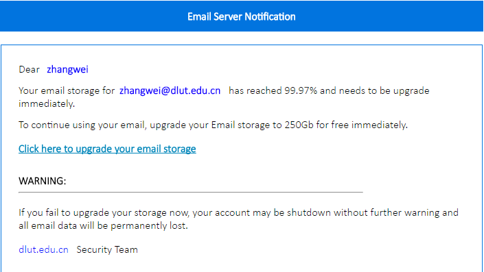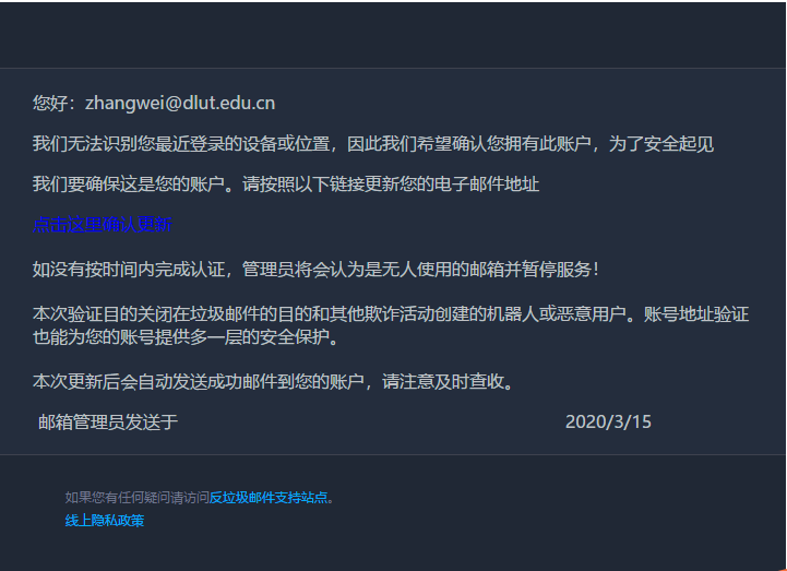 以下为典型的钓鱼邮件截图,用户可参考示例,类似邮件皆为钓鱼邮件。网信中心所有的通知都会有“大连理工大学网络与信息化中心”的落款,并且网信中心不会以任何名义索要用户的邮箱名和密码信息。