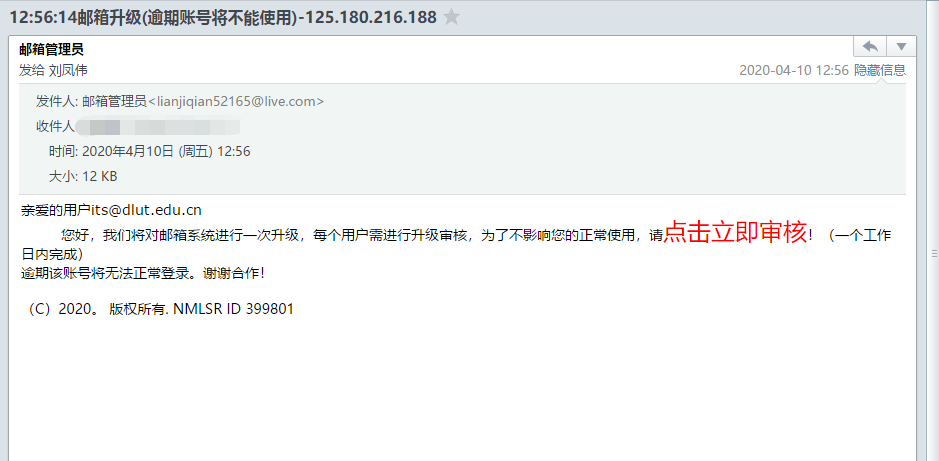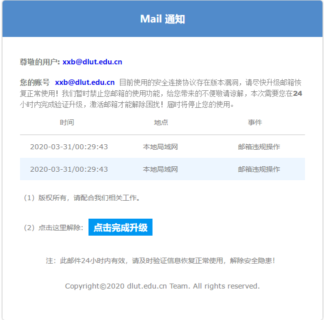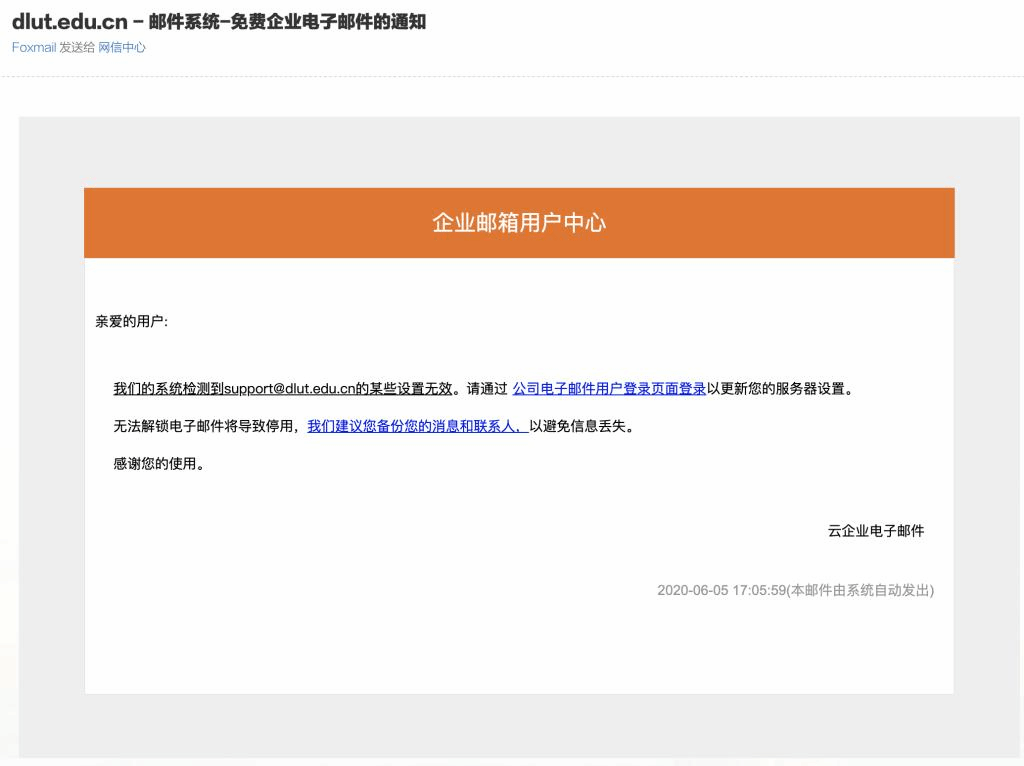 如果已点击邮件中链接,并输入了邮箱名和密码,请立即登陆网页版邮件系统(https://mail.dlut.edu.cn)修改密码。