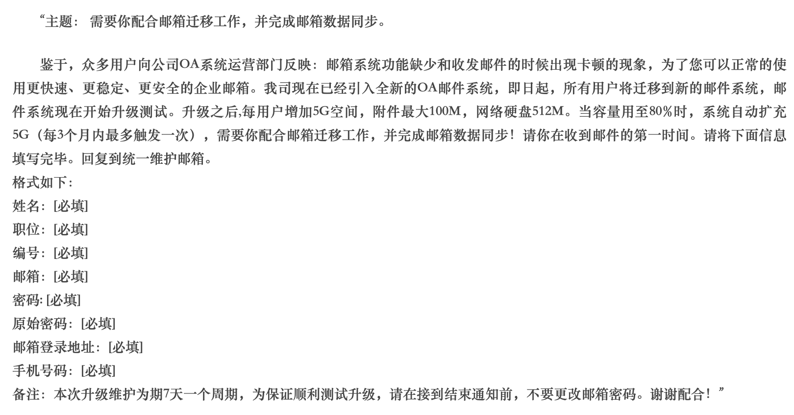 钓鱼邮件通常以通知的方式,通知用户系统需要升级,用户需点击邮件中的链接,填写相应的信息进行信息核对,否则邮箱将无法使用。用户点击链接进入所谓的信息核对页面后,就会要求用户填写邮箱名及邮箱密码,用户一旦填写,邮箱密码就会被不法份子盗取。
