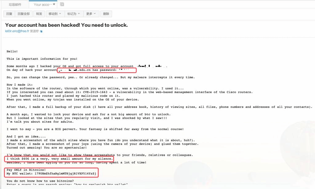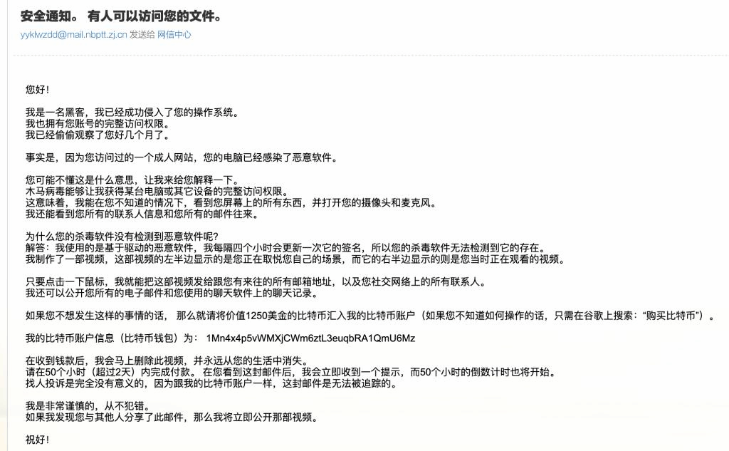 图12钓鱼邮件示例12(邮件内容为诈骗信息,索要比特币,中文版)