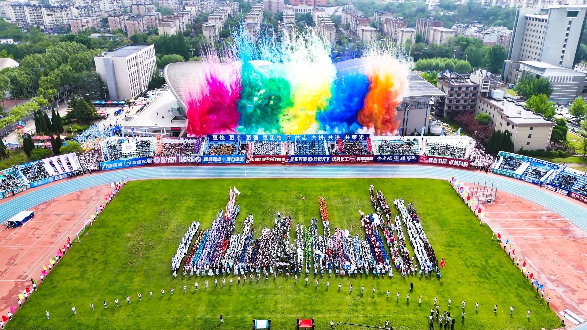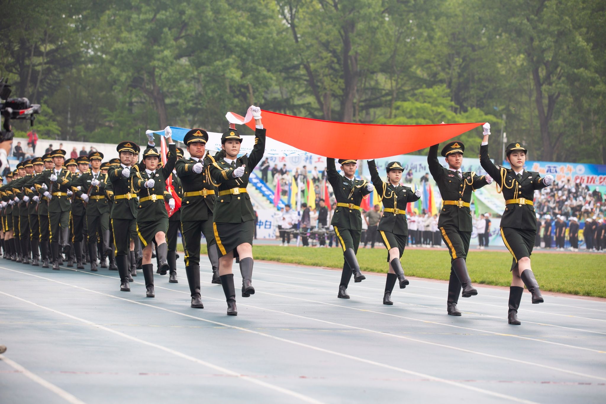 在激昂的乐声中,国旗护卫队、花束队、彩旗队、裁判员、校运动员代表方阵、各学院师生方阵、教职工方阵依次入场。铿锵有力的步伐、振奋人心的口号、各具特色的展演,尽显大工人拼搏进取的昂扬斗志、积极向上的精神风貌。