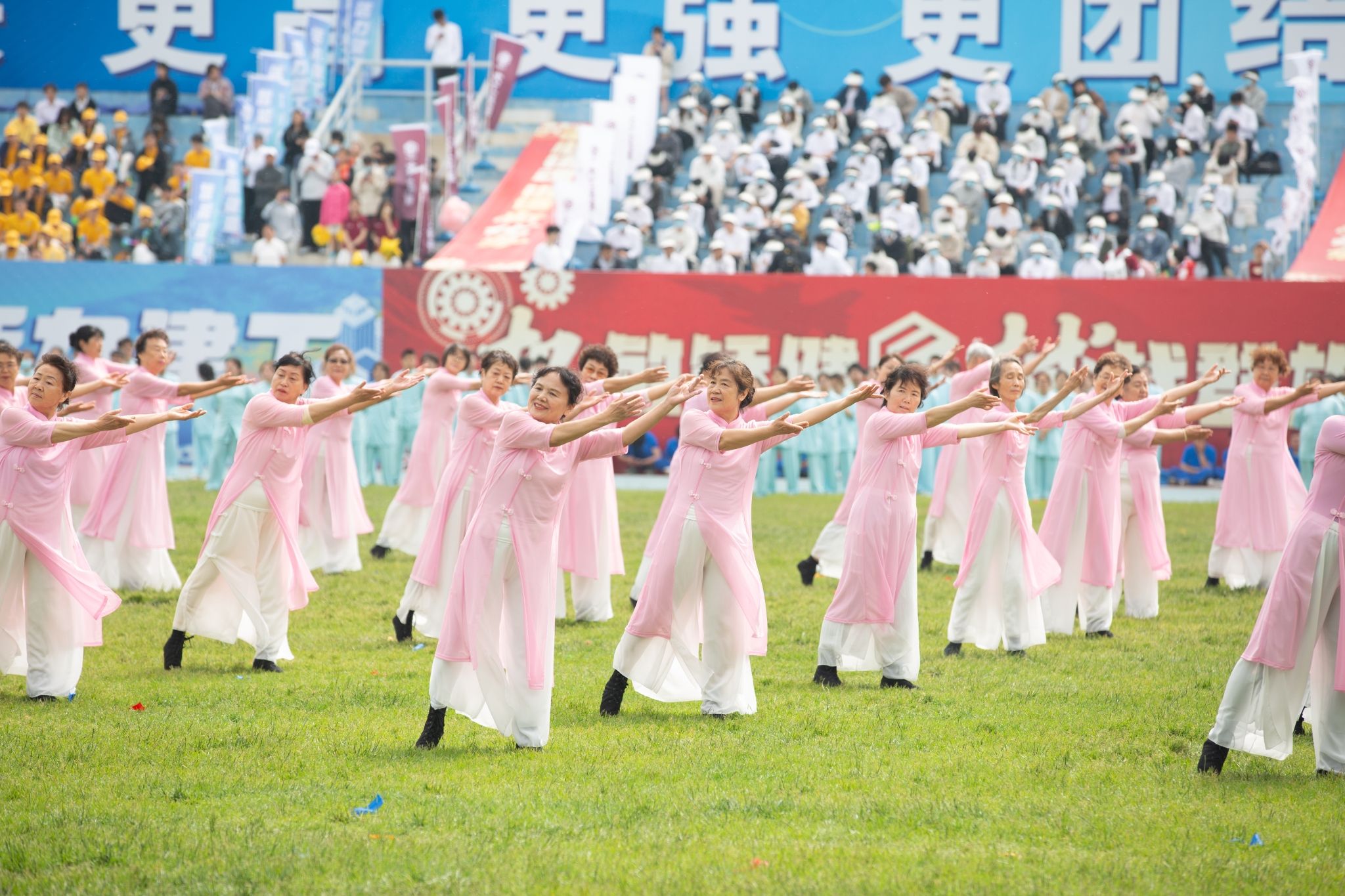 鼓乐声响,旌旗猎猎,在一片欢呼声中,迎来了“龙韵中华、逐梦大工”中国民族传统体育项目表演。由学校本科生、附属学校学生、离退休教师等2025人组成的表演队带来了一场震撼与感动交织的视觉盛宴。公共体育课武术班级400名同学组成的彩旗队,以武之魂铸旗之魂,展现新时代大学生的蓬勃朝气与使命担当;附属学校480名学生组成的团体操表演,以活力四射的舞步演绎工附少年的激情。彩带如龙腾跃,响扇似鼓争鸣,健美操班与形体班学子联袂献上《龙腾扇舞》;形意拳表演队的《拳启新程》表演气势磅礴、刚柔并济;《灵狮炫舞》将传统舞狮艺术与现代电子音乐巧妙融合,赢得现场阵阵喝彩;退休教职工组成的银发舞蹈队带来的《朝霞映辉》展现岁月沉淀的优雅。最后,师生齐唱《高飞》,唱响建设世界一流大学的壮志豪情,将现场气氛推向高潮。