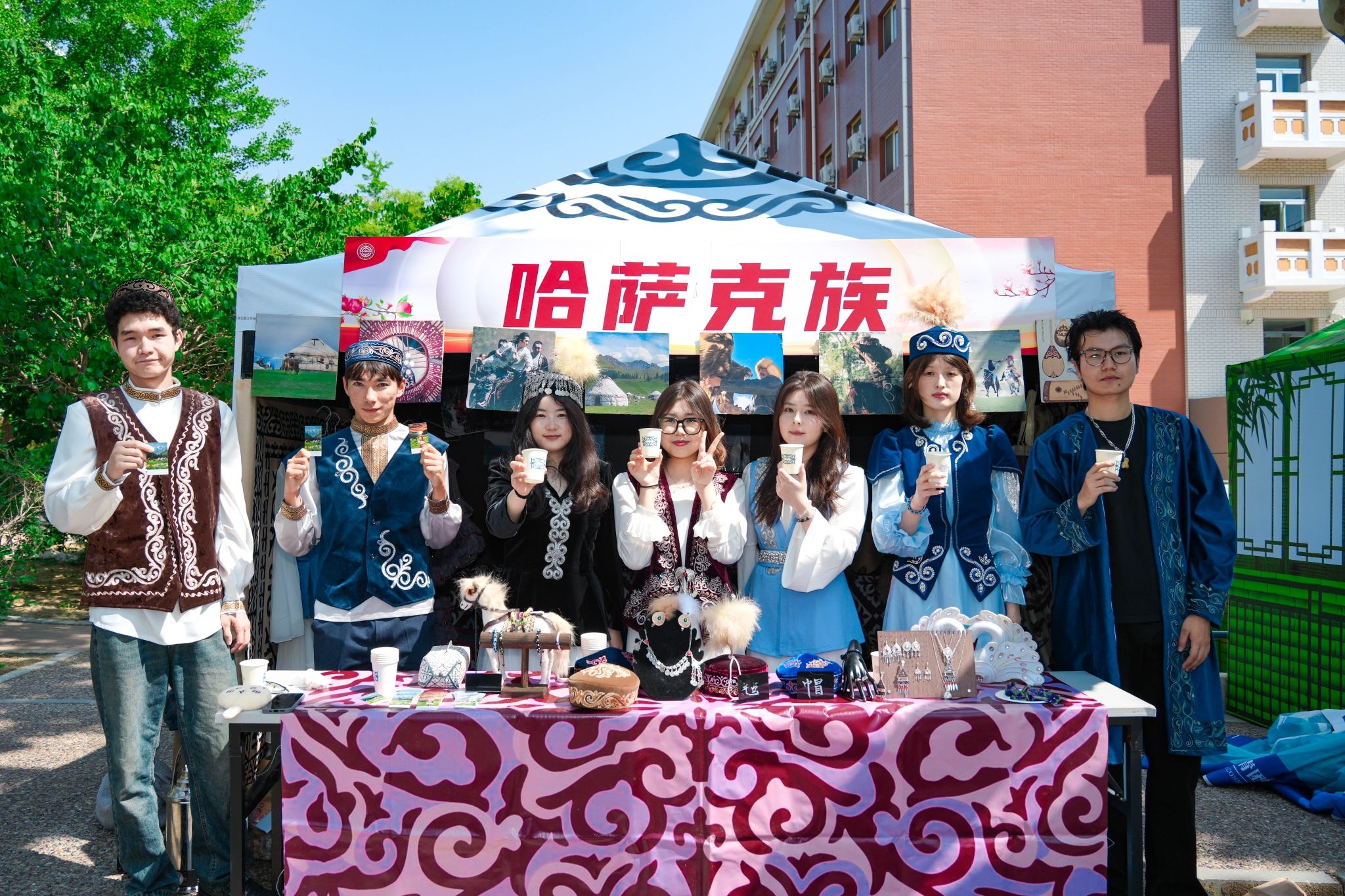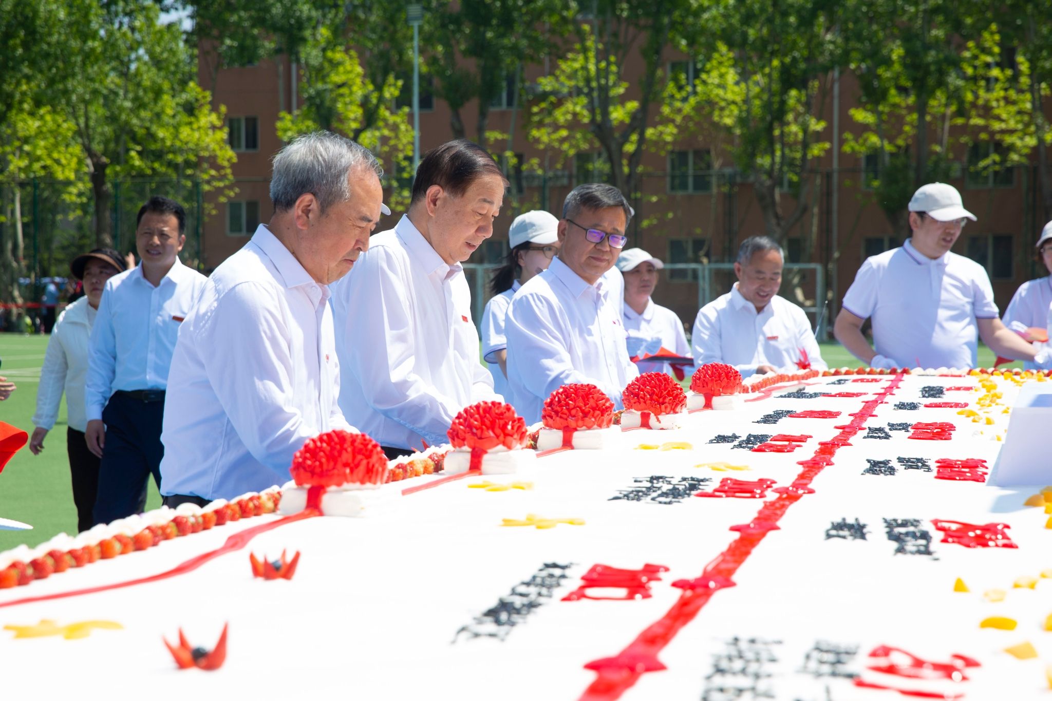 “幸福·畅享”展区里,各色美食香味四溢,让人垂涎欲滴,五湖四海的校友相聚一堂,共同追忆鎏金岁月。校庆大蛋糕前已经排出了长队。这个用10000枚鸡蛋、3000斤面粉、400余斤牛奶、50斤新鲜水果制作的长7.6米、宽2.4米的大蛋糕可供万余人共同享用。当第一块蛋糕被切开,香甜的气息弥漫在空气中,师生们品尝着美味,脸上洋溢着幸福的笑容。“民族团结一家亲”展区,各民族的学子们穿上了民族服饰、跳起了民族舞蹈。美食、文化、情谊汇聚,师生们在这里获得了满满的幸福感。